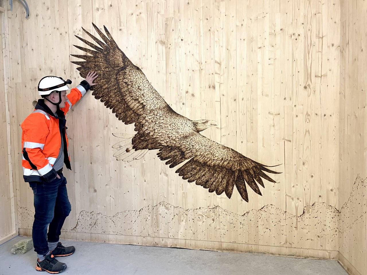Kunstner Robert Johannsson er i gang med utsmykking av vegger med nydelig kunst, som står til de røffe materialene i bygget.