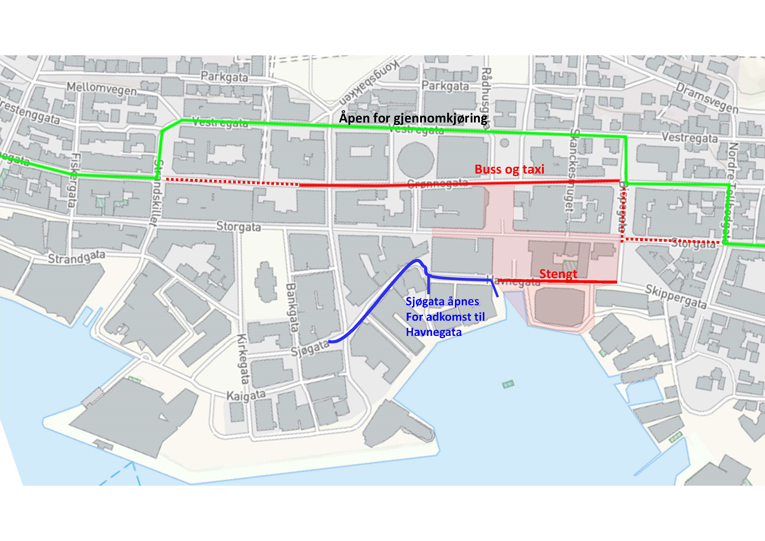- Grønnegata mellom Fredrik Langes gate og Bispegata reserveres for buss, taxi og varelevering.